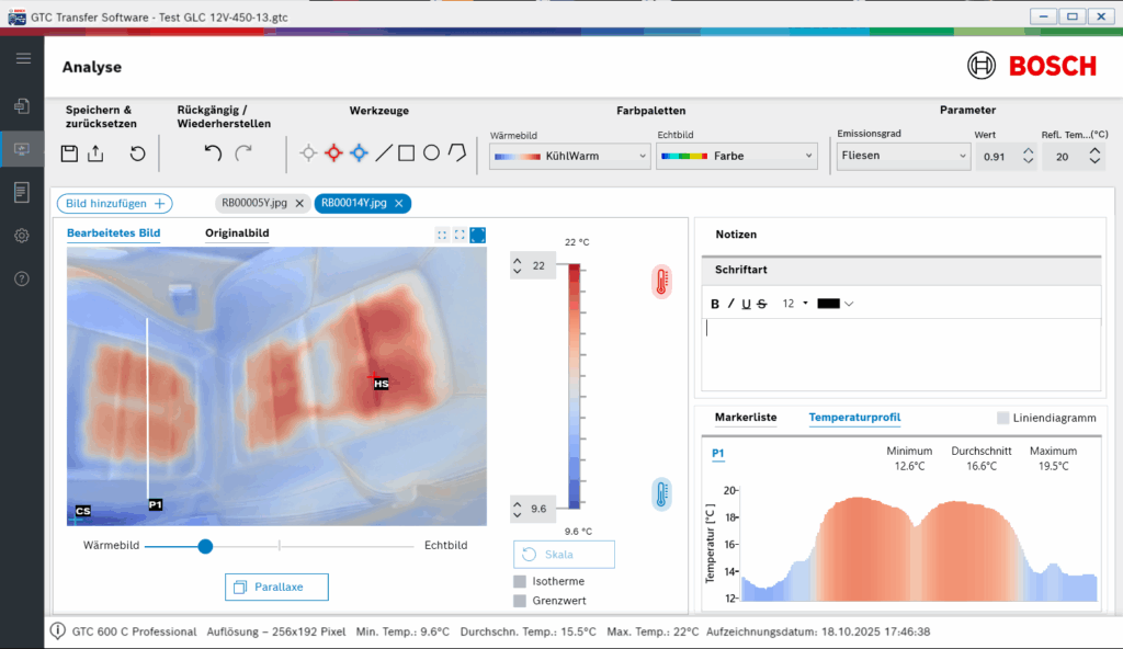 Die GTC 12V-450-13 weist eine USB-C Schnittstelle auf, mit der Messresultate also zwei Fotos je Messung mit der GTC Transfer-Software für Windows-Rechner übetragen werden können. Prinzipiell geht das Übertragen auch ohne dieses Programm. Aber es ist ein empfehlenswertes Programm, mit dem gespeicherte Wärmebilder und klassische Fotoaufnahmen dokumentiert und nachbearbeitet werden können. Dieses Programm bietet breite Möglichkeiten, wie die Wärmeaufnahme – also die Zuweisung einer Temperatur zu jedem Pixel – im Nachhinein bearbeitet werden kann. Selbst dann, wenn bei der Aufnahme des Wärmebildes an der Wärmebildkamera ein ungünstiges Farbschema ausgewählt war, lässt sich diese Einfärbung mit dem GTC Transfer Programm auf vorgegebene oder selbst zu definierende Farbverteilungen ändern.